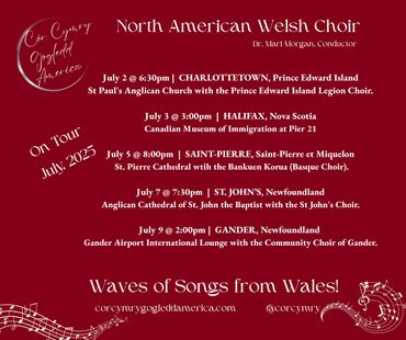 As you are aware, earlier this summer, Côr Cymry toured Atlantic Canada and Saint-Pierre et Miquelon. I’m delighted to share that the tour was an enormous success! We gave 5 outstanding concerts in significantly striking venues, in collaboration with 4 memorable local choirs.